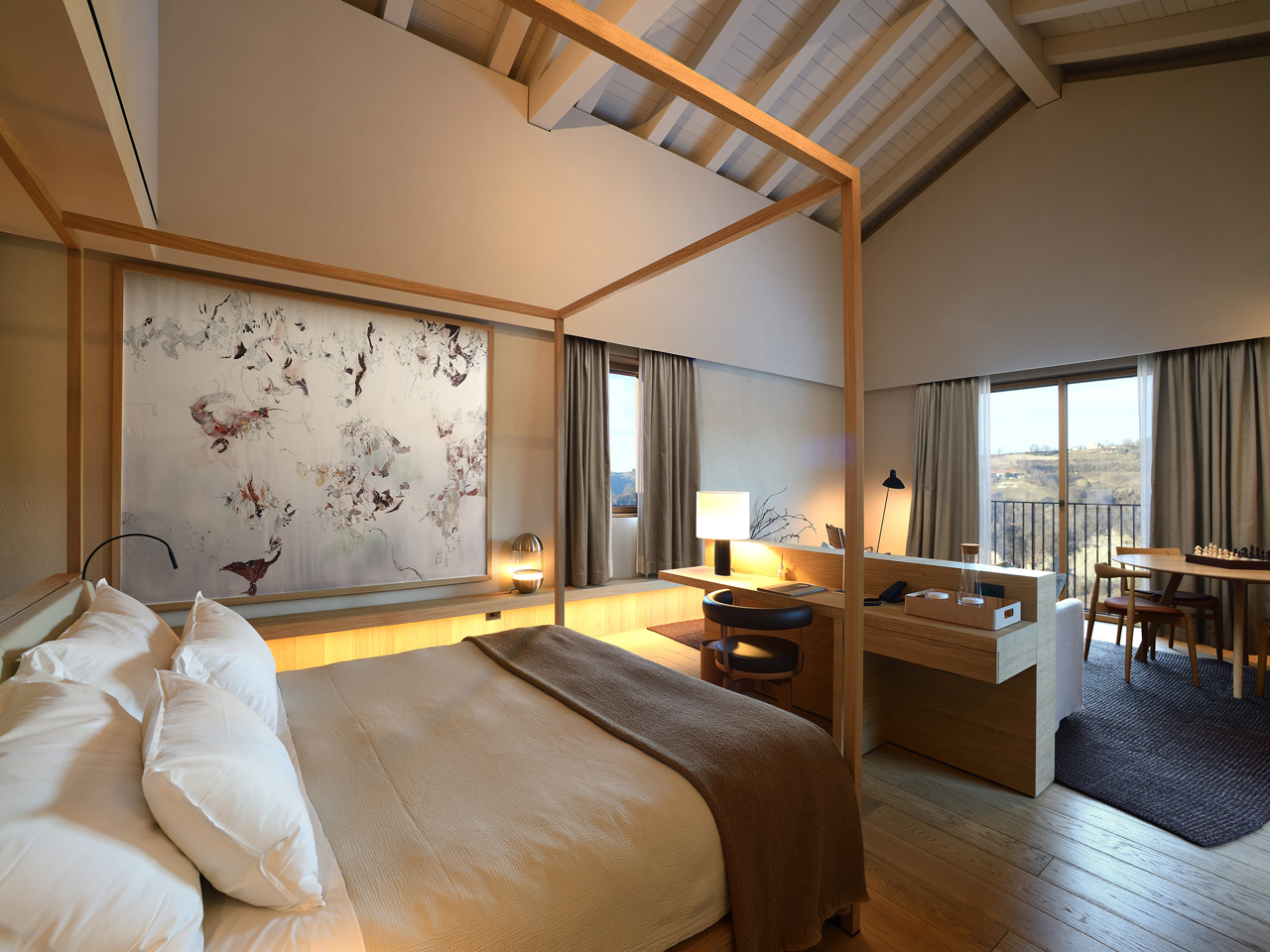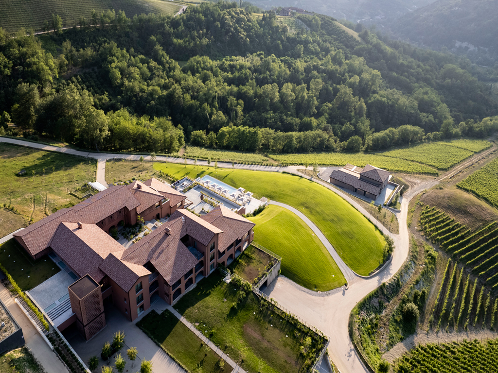 A luxury resort, surrounded by 42 hectares of parkland, vineyards and rolling hills that accompany the eye to breathtaking views. The structure, ideally located in a small hamlet, was built with local materials and inspired by traditional architecture by sustainable choices in respect of the environment. At the restaurant, you can taste typical Piedmontese cuisine, products from the vegetable garden at 0 km, paired with local and international wines. The heated infinity pool and the ecological spa are available for a relaxing holiday immersed in nature. All rooms are equipped with every comfort, furnished with light tones, specially selected materials and fabrics, and a private terrace with relaxation area.